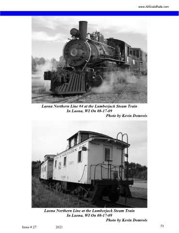 www.AllScaleRails.com Laona Northern Line #4 at the Lumberjack Steam Train In Laona, WI On 08-17-09 Photo by Kevin Domrois Laona Northern Line at the Lumberjack Steam Train In Laona, WI On 08-17-09 Photo by Kevin Domrois Issue # 27 2021 73